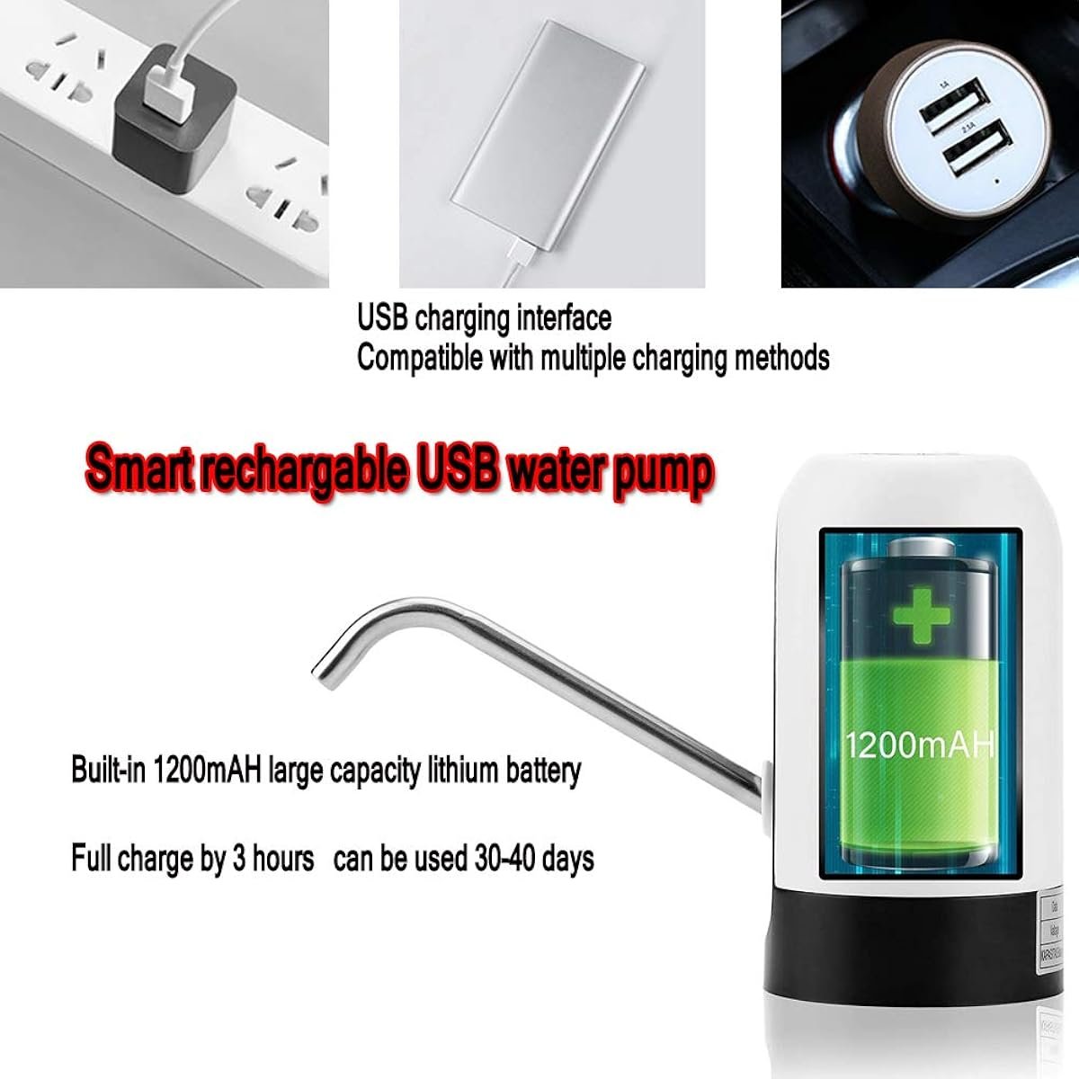 - موزع مياه قابل لإعادة الشحن عبر USB: بطارية مدمجة قابلة لإعادة الشحن بقوة 1200 مللي أمبير في الساعة